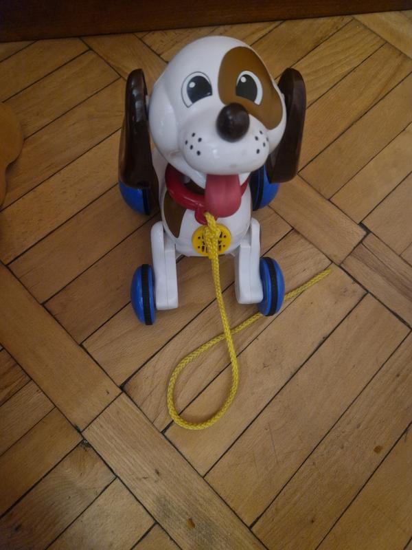 Веселе щеня — розвивальна звукова іграшка для дітей від 10 місяців. Візьміть щеня з собою на прогулянку! Воно буде гавкати та весело слідувати за малюком. Іграшка розвиває просторове мислення, спритність і координацію рухів. Кожна дитина мріє мати справжнього друга. А ця симпатична собачка, як жива. Варто тільки дитині потягнути за мотузочку, як щеня, весело гавкаючи та ляскаючи вушками, побіжить за нею, а коли втомиться, сяде на задні лапки та почне скавчати. Хто ж розлучиться з таким другом? Іграшка розвиває просторове мислення, спритність і координацію рухів. Щеня озвучений та анімований. Все працює!