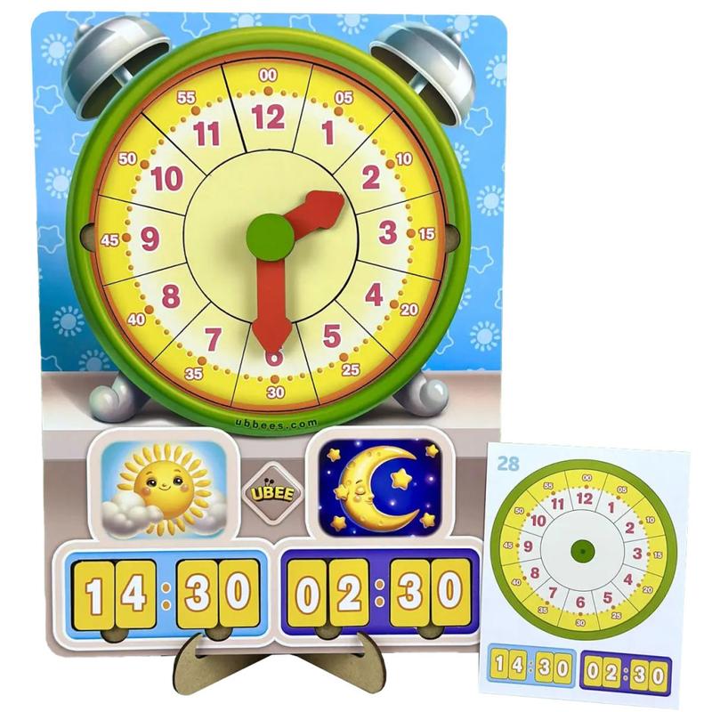 Дитяча деревʼяна розвиваюча гра «Годинник - Вчимо час» У наборі: деревʼяний інтерактивний годинник, циферблат якого розбирається, цифри та 30 завдань різної складності, такі як: - збери за зразком; - визначи час за стрілками та вистав самостійно числа; - розташуй самостійно стрілки, орієнтуючись на числа. Вік: 6+ Розмір: 32 х 23 см. Маленькому чоловічку доволі складно розібратись з годинником, бо час, це те, що важко уявити: його не почути, не побачити, не помацати руками. Як же навчити дитину розуміти такі абстрактні поняття? Допоможе батькам в цьому "Годинник - Вчимо час" За допомогою цієї гри ваша дитина в цікавій розважальній формі засвоїть такі складні для неї питання, як час доби, що таке ранок, день та вечір, години та хвилини, навчиться орієнтуватися в русі годинникових стрілок. Розкажіть дитині про те, що годинник складається із циферблата та стрілок. Циферблат – це панель годинника, з числами від 1 до 12 та 60 поділками по колу. Коротка стрілка вказує на годину, довга – на хвилини. Розкажіть, у яку сторону рухаються стрілки. Коротка стрілка називається годинною. Якщо вона зробить повний оберт пройде 12 годин. Якщо стрілка зробить 2 повні оберти, то пройде 24 години або доба. Навчіть дитину розрізняти пів години. Розкажіть, що хвилинна стрілка за годину минає усе коло, а за пів години вона минає пів кола. Хвилинна стрілка рухається значно швидше, ніж годинна. Якщо хвилинна стрілка вказує на 6, значить, вона уже пройшла половину години.