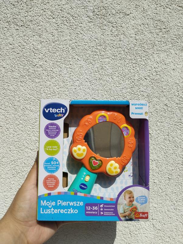 Інтерактивна іграшка VTech Baby Моє Перше Дзеркальце (Lumi Lion Mirror Rattle) — чудовий подарунок для малюків від 12 до 36 місяців. Дзеркальце з голографічним ефектом показує мордочку лева та пропонує 4 режими гри: «Чарівне дзеркало», «Серце, що миготить», «Лапа, що навчається» та «Музична лапа». Малюк зможе насолоджуватись понад 50 піснями, мелодіями, звуками та фразами польською мовою. Іграшка допомагає розвивати словниковий запас, сенсорні відчуття, моторику та самосвідомість дитини. Завдяки зручній ручці малюк легко триматиме її в руках. Працює від 2 батарейок LR03 (у комплекті). Ідеальна розвивальна іграшка для перших відкриттів вашої дитини!
