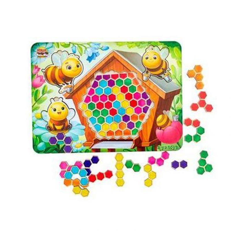 Яркая и интересная игра. Пчелки – это вкладыши, а сам улей-домик – это тетрис, который малышу необходимо собрать (сначала можно пользоваться картинкой- подсказкой). Все детали легко доставать пальчиком. Предложите ребенку сосчитать шестиугольники по цвету. Придумайте интересную историю о пчелах- труженицах. Бренд: Ubumblebees Упаковка: Пленка Цвет: Разноцвет Вес в упаковке: 310 г Габариты в упаковке: 0.2 x 32.5 x 23.5 см Габариты без упаковки: 0.2 x 32.5 x 23.5 см Cтрана производитель: Украина Материал: Дерево Комплектация: Сортер-пазл