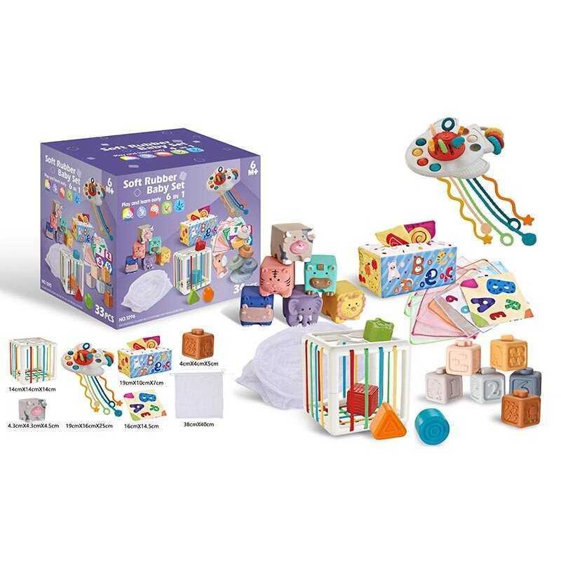 Одним з найважливіших етапів у житті людини є ранній розвиток, коли кожен має сповна розвинути усі свої органи чуття та усі моторні функції, тому цей етап навчання має вплив на усе подальше життя людини. Із цим набором для розвитку, ваш малюк матиме чудовий і веселий початок цього навчання, адже в одному наборі зібрані іграшки, які допоможе дитині розвинути дрібну моторику її рук із різноманітними пальчиковими іграми та когнітивні здібності із наборами фігурок і кубиків, які можна складати. Також цей набір має широкий спектр текстур, кольорів та звуків, що допоможе малюкові розширити його аудіо- візуальне та тактильне сприйняття навколишнього світу. Особливості: - у наборі 33 елемент; - 4 фігурки-брязкальця; - 6 кубиків-тваринок; - 6 рельєфних кубики з цифрами й формами; - текстильна коробка для серветок; - 4 серветки з ефектом шелестіння; - 10 текстильних багаторазових серветок; - сітчастий мішечок; - куб із формами та разнокольоровими резинками замість стінок; - брязкальце з прорізувачами та двома пальчиковими іграми. * Характеристики та комплектація товару можуть змінюватися виробником без повідомлення