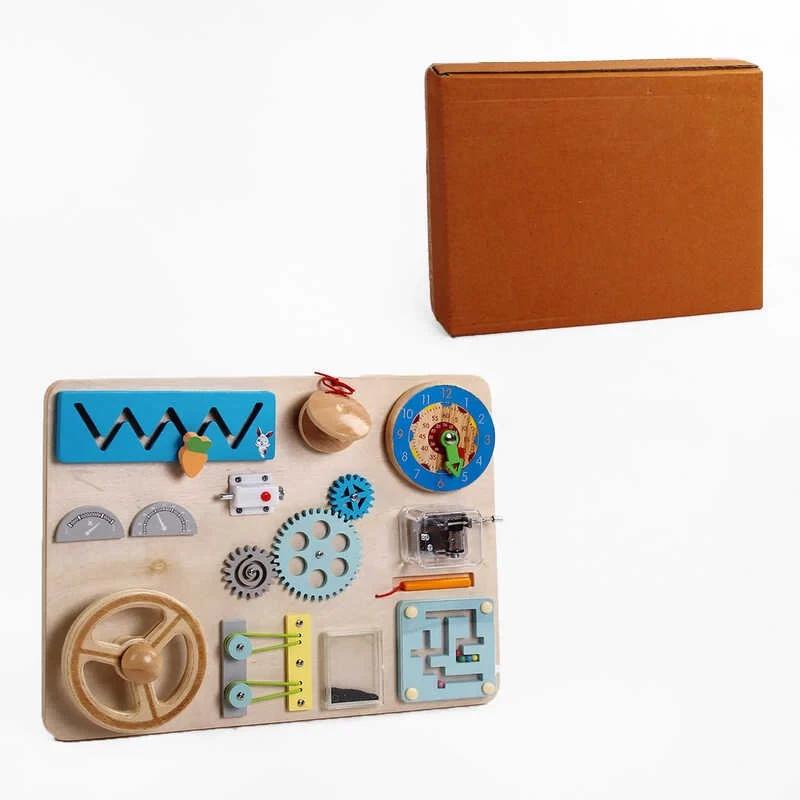 Подарите своему малышу невероятную развивающую игрушку! Этот бизиборд — идеальное решение для любознательных и активных детей, которые стремятся исследовать окружающий мир. С его помощью ваш малыш сможет познавать различные тактильные ощущения, что значительно расширяет его горизонты. Изготовленный из экологически чистого и безопасного дерева, бизиборд предлагает множество интересных пальчиковых игр и фиджетов, которые обеспечивают часы увлекательного обучения. В комплекте вы найдете магнитный стилус для игры с лабиринтом и железной стружкой, что делает игру еще более интерактивной. Макет руля и спидометра позволяет детям погрузиться в мир ролевых игр, а музыкальная шкатулка подарит спокойные мелодии, которые успокаивают и создают атмосферу уюта. Основные особенности: - Размеры: 39х6х29.5 см; - Изготовлен из отшлифованного и лакованного дерева; - Множество пальчиковых игр для развития моторики; - Макет руля для ролевых игр; - Музыкальная шкатулка со спокойной мелодией; - Магнитный лабиринт с железной стружкой и стилусом; - Механические шестерни для дополнительного обучения; - Игрушечные часы для развития времени.