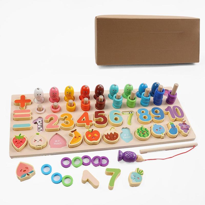 Логическая деревянная доска С 74472 (18) игра с колышками, названия англ. на языке, магнитная рыбалка, вкладыши, цифры, овощи, фрукты, цветные кольца, сортер, в коробке