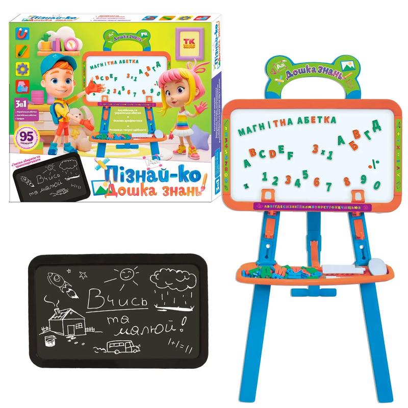 2265 Відкрийте для маленьких розумників дивовижний світ знань разом з магнітною дошкою! Долучайте маленьких непосид до цікавої гри, під час якої вони познайомляться з цифрами, а також українською та англійською абетками. Можна складати перші слова, вигадувати чудернацькі комбінації з літер, знаходити прості рішення, грати у відгадайку та головне - малювати! Двостороння дошка дозволяє малювати як маркерами, так і крейдою. Тож обирайте свій зручний інструмент художника та починайте творити разом із “Пізнай-ко”! Особливості: - 95 елементів; - розміри мольберта у зібраному вигляді: 45х43х95 см; - розміри дошки: 45х31 см; - дошка є двосторонньою з одною стороною для маркерів, а іншою для крейди; - до набору включено магніти із літерами української та англійської абеток, а також цифр та математичних дій; - до набору додано маркер для білої дошки та крейду; - у комплект включені наліпки для декорування зібраного мольберта; - елементи набору виконано з міцного та легкого первинного пластику. Розміри / габарити - Довжина (см):45 см - Ширина (см):43 см - Висота (см):95 см