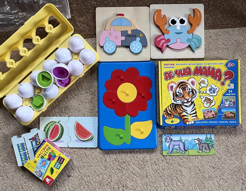Комплект розвиваючих іграшок в ідеальному стані для дітей від 1 до 4 років. В наборі: • 2 дерев'яні пазли з яскравими зображенням поліцейськоі машинки та краба • Картонна розвиваюча гра "Ціле і частина" з фруктами та овочами • Яйця-сортер жовтого кольору з білими та кольоровими елементами для розвитку дрібної моторики • Картонна гра "Де чия мама?" з 24 картками для вивчення тварин та їх дитинчат • Пазл-квітка з червоними пелюстками та жовтою серединкою Іграшки розвивають: - Логічне мислення - Дрібну моторику - Координацію рухів - Знання про тварин та їх дитинчат - Розуміння понять "ціле і частина" - Навички сортування та класифікації Всі елементи в відмінному стані, готові до використання.