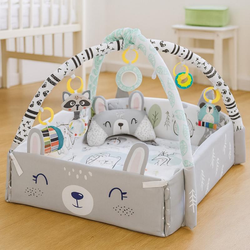 Подаруйте своєму малюку світ захоплюючих ігор та розвитку з інтерактивним дитячим килимком Ricokids Rabbit! Цей яскравий килимок з бортиками стане улюбленим місцем для ігор, відпочинку та перших відкриттів. Підвісні іграшки та милий дизайн стимулюють уяву та дрібну моторику, даруючи радість щодня. Переваги: - Просторий розмір - Надійні борти - Забавні підвісні іграшки - Розвиток рухових навичок - М'який та затишний - Привабливий дизайн - Просте чищення Опис: Інтерактивний килимок Ricokids Rabbit з бортиками - це ідеальний простір для гармонійного розвитку вашої дитини в ігровій формі. М'яка поверхня килимка створює комфорт для лежання, сидіння та перших повзків. Захисні борти забезпечують безпеку, запобігаючи випадковому випаданню за межі килимка. Підвісні іграшки у вигляді милих звірят і яскравих кілець сприяють розвитку зорового сприйняття та координації рухів. Насичені кольори та цікаві малюнки пробуджують цікавість та стимулюють уяву. Килимок легко складається, що спрощує його зберігання та транспортування. Виготовлений із безпечних, гіпоалергенних матеріалів, що особливо важливо для здоров'я малюка. Підходить для використання з перших днів життя, перетворюючи кожну хвилину на корисне та радісне проведення часу. Завдяки розміру 110х100х53 см, у дитини буде достатньо місця для активних ігор та рухів. Це чудовий вибір для сучасних батьків, які дбають про якість та зручність. Характеристики: - Тип: килимок для дитини - Матеріали: тканина, пластик - Іграшки: так - Подушка: так - Складаний дизайн: так (3 комбінації) - Особливості: бортики, що піднімаються, перестановка будь-яких елементів - Килимок двосторонній: так - Європейські стандарти: EN 71 - Розміри килимка - 110 х 100 х 53 см Комплектація: - Ігровий килимок для дітей - Іграшки - 6 шт - Кульки - 18 шт - Подушка - Упаковка