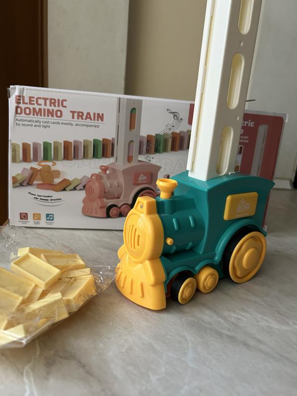 Поїзд музичний, їздить розтавляючи фігурки доміно. На батарейках.