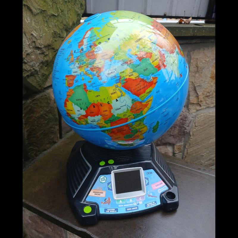 Великий,масивний,матеріал пластик, глобус також із пластику,на екрані засвічується те,що вибрали спеціальною ручкою.