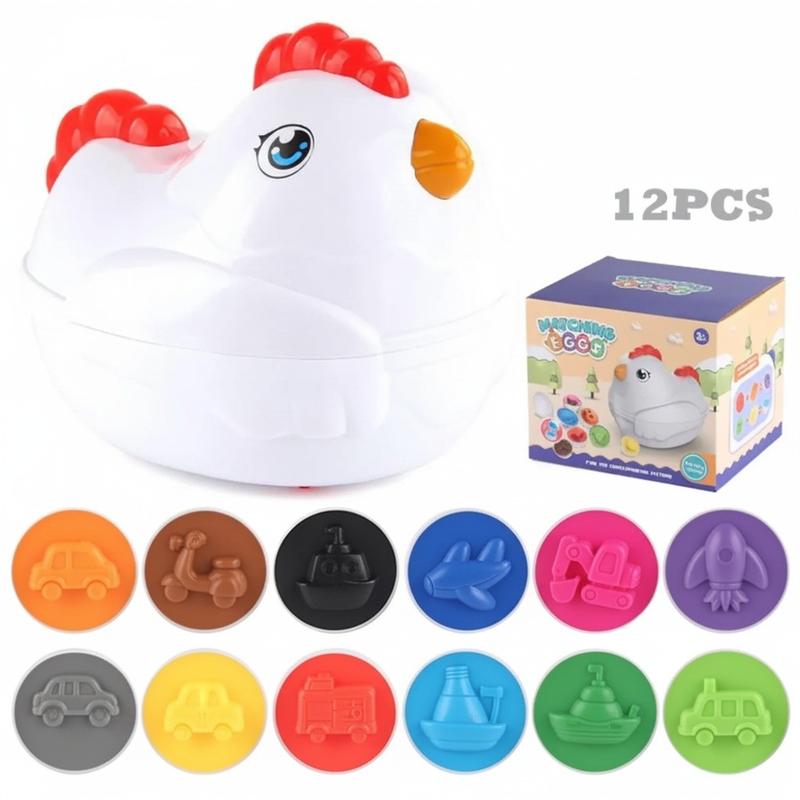 Опис Призначення: Іграшка призначена для розвитку дрібної моторики, координації рук і очей, а також для вивчення кольорів і форм. Склад набору: В комплект входять 12 білих яєць, які розбираються на дві половинки. Усередині кожної половинки є рельєфна фігура певного кольору.Механіка гри: Завдання дитини — зіставити половинки за формою й кольором, щоб зібрати ціле яйце.Упаковка: Яйця зберігаються у великому пластиковому контейнері у формі курки, що спрощує їхнє зберігання й перенесення. Контейнер також можна використовувати як каталку.Матеріали: Іграшка виготовлена з безпечного, нетоксичного пластику з гладкими краями.