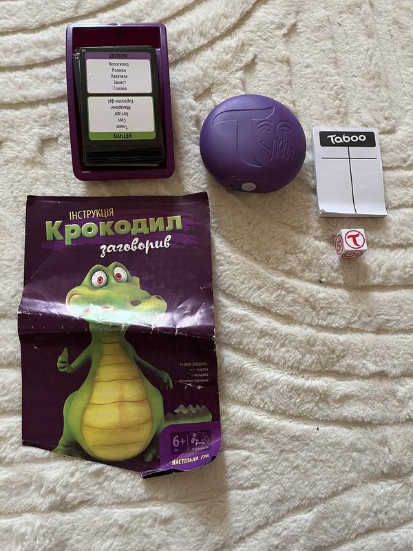 Це розважальна гра для компаній, де гравцям потрібно пояснювати слова з карток, не використовуючи при цьому певні "заборонені" слова, зазначені на картці. Опис ігрового процесу Мета гри: Гравці діляться на команди. Завдання команди — вгадати слово, яке пояснює їхній ведучий, швидше за команду суперників. Ігровий процес: Ведучий бере картку зі словом і намагається пояснити його своїй команді, не використовуючи при цьому низку "слів-табу", які також вказані на картці. Якщо ведучий використовує заборонене слово, суперники можуть натиснути на спеціальну "пищалку" (фіолетовий предмет на фото), і хід переходить до них. Комплектація: До набору входять картки зі словами українською мовою, інструкція, іноді може бути таймер або ж, як на фото, пищалка та кубик для визначення умов пояснення слів. Навички: Гра розвиває артистизм, асоціативне мислення та розширює словниковий запас. Вона підходить як для дітей (від 6 років), так і для дорослих компаній. Ця гра чудово підійде для веселого проведення часу з друзями чи родиною. На жаль немає коробки з цієї гри 😕