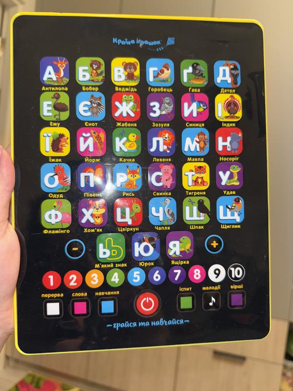 «Вітаю, друже! Ми будемо вивчати українську мову! Ти познайомишся з буквами і звуками українського алфавіту. Почуєш україномовні слова і вивчиш віршики »! 6 режимів навчання в невимушеній атмосфері гри: 1. Перерва: «Перерва! Треба відпочити і побешкетувати, терміново потрібна рухома гра! Давай пограємо в гру «літачок». Рухлива гра для активного відпочинку. 2. Слова: «Вчимо букви і слова. Слухай уважно назви тварин і запам'ятовуй ». Зоо-абетка, цифри, кольори. 3. Навчання: «Кожна буква має свій віршик. Послухай їх ». 43 вірша про буквах і цифрах. 4. Іспит: «А тепер іспит! Давай перевіримо твої знання! Слухай уважно питання і натискай картинки-відповіді ». 85 питань (знайди букву, тварина, кольорову цифру, натисни цифру). 5. Мелодії: «А тепер веселощі! Давай танцювати і співати »! 3 мелодії, 1 весела пісня. 6. Вірші: 2 вірша. Барто в українському перекладі. "Країна іграшок" дарує можливість для навчання в невимушеній атмосфері грі. Весело вчитися, легко і цікаво! Озвучено українською мовою. Працює від 3-х батарейок типу ААА (у комплект не входять).