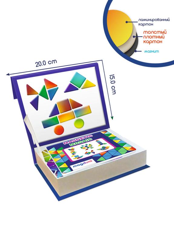 Магнітна Мозаїка – це набір для творчості та розвитку дитини. • Багато магнітних деталей дозволить дитині створювати безліч цікавих фігурок. • Коробка-книга з магнітним полем зробить процес гри зручним та комфортним, адже все завжди буде під рукою. набір карток з 44 варіантами фігурок від простих до складніших, а через деякий час дитина зможе сама вигадувати та створювати зображення, адже з різнокольорових трикутників, квадратів, прямокутників, кружечків та овалів можна придумати стільки цікавого! Деталі мозаїки надійні та зручні, добре магнітяться до поля та будь-якої металевої.