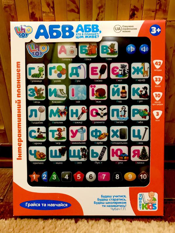 Дитячий розвиваючий планшет - це іграшка, яка буде не тільки розважати дитину, а й навчати його під час гри. З допомогою такого планшета дитина у грайливій формі зможе: - вивчати букви і цифри - пограє в гру "знайди слово і цифру" - вивчати звуки і кольори - візьме участь у цікавих вікторинах - зможе вивчити 33 вірша - 10 віршиків про цифри - 3 пісні - 42 загадки - отримає базові знання арифметики для самих маленьких Планшет озвучений українською мовою. Розмір планшета 19.5 на 25 см