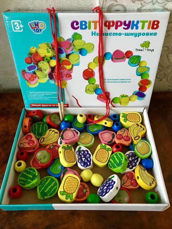 Такая яркая шнуровка станет для ребенка одновременно развлекательной и развивающей игрушкой. В наборе есть множество деревянных бусинок, на которых нарисованы различные фрукты и ягоды. Каждая деталь дополнена небольшим отверстием, в которое малыш сможет продевать шнурок, нанизывая фрукты на него. Можно выбирать для ребенка различные вариации заданий: нанизывание на шнурок разных цветов, фруктов или бусинок, или каких - либо комбинаций. Игра со шнуровкой будет развивать мелкую моторику, внимательность, логику, а также улучшит восприятие цветов и форм. Размер упаковки: 28 - 21 - 3,5 см