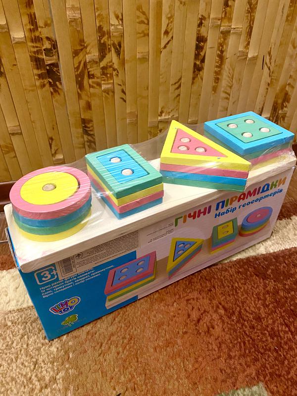 Захоплююча розвиваюча пірамідка - сортер являє собою дерев'яне підставу у вигляді дощечки з гвоздиками (штирькамі) для нанизування фігур. Форма цвяшків і відповідних їм отворів у фігурах, дозволяє малюкам познайомитися з геометричними фігурами: квадратом, прямокутником, колом і трикутником. Різнокольорові фігури зроблять гру ще більш захоплюючою і допоможуть дитині у вивченні кольору. Гра розвиває дрібну моторику, увагу, пам'ять, логічне та просторове мислення, логіку, уяву, знайомить з новими геометричними формами і сприяє розвитку цветовосприятия. Такий подарунок дитині принесе набагато більше користі, ніж звичайна іграшка! Розмір упаковки 31-12-5,5