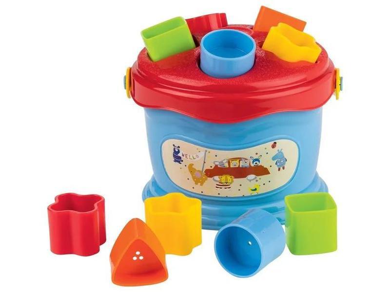 Відерце-сортер Playtive + 10 кольорових вкладок: 2 циліндра, 2 зірки, 2 трикутника, 2 квадрата і 2 знака плюса.