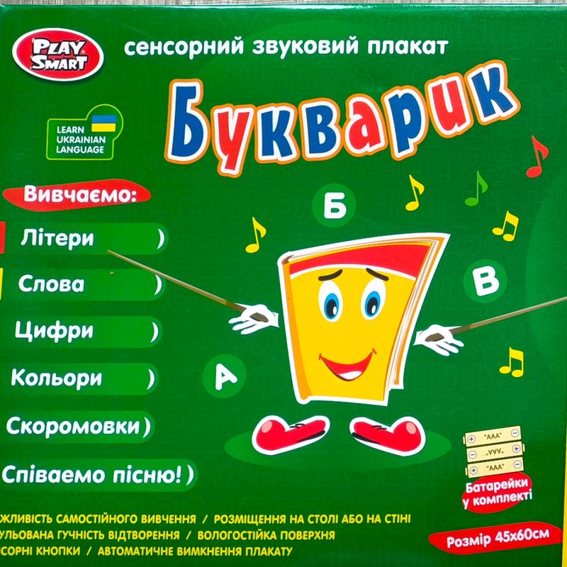 Плакат имеет следующие функции: Изучение - при выборе этой функции интерактивный Букварик произносит весь алфавит. При нажатии на кнопку, у буквы сначала прозвучит название буквы, а при повторном нажатии - название предмета, изображенного у этой буквы. Похожий урок с цифрами и цветами: при нажатии на цифру озвучивается ее название, при повторном нажатии - цвет. Интерактивный плакат может экзаменовать ребенка. Это очень удобно, для того чтобы малыш сам понимал - изучил он или еще нет. Когда ребенку надоест учиться, то он сможет послушать скороговорки, а также прослушать веселую песенку.