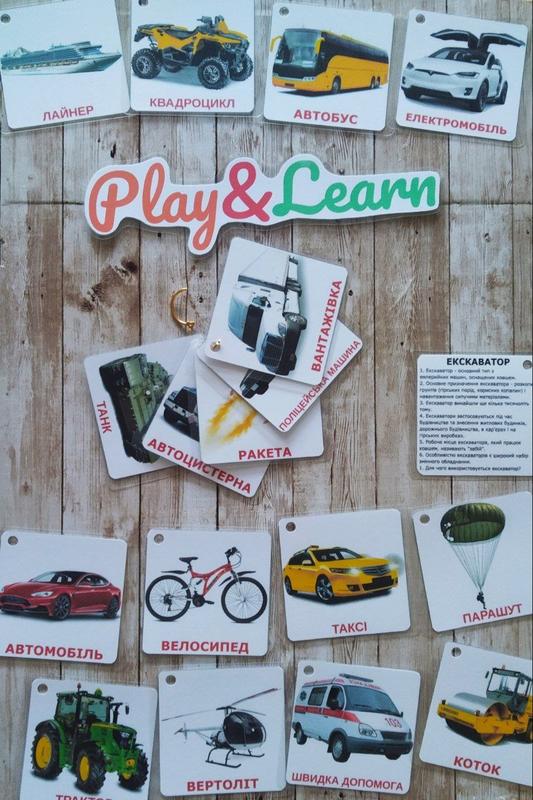Мова: українська. У будь-яку тему входять: 18 карток. Картка містить зображення та підпис з одного боку; факти та завдання з іншого боку. Картки містять захисті поля ламінації. Набір скріплений металевим кільцем (легко знімається та одягається).