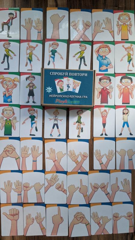 Нейропсихологічна гра спробуй повтори У набір входять 74 ламіновані картки у форматі А6: - зображення рук - зображення тіла - картки-похибки (які неможливо повторити - задача гравців знайти їх та вказати на це)