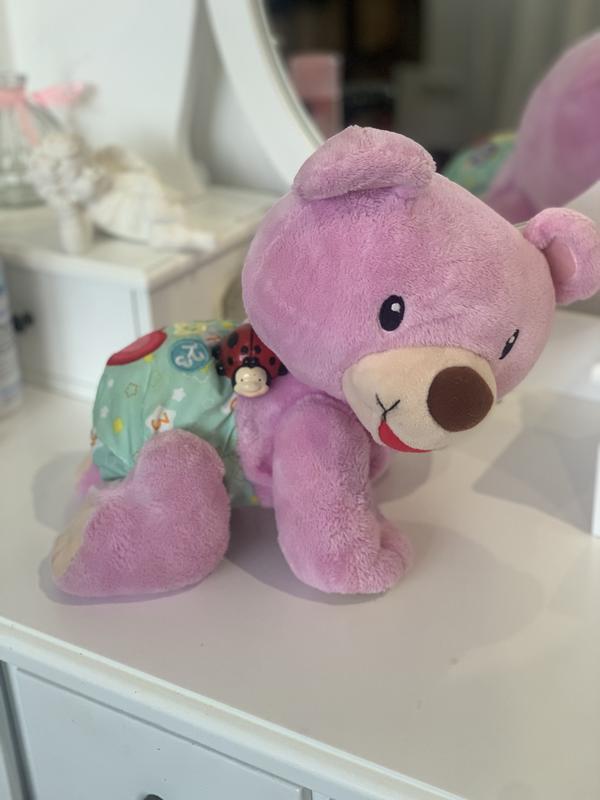 На англійській мові VTech" - это очень милый компаньон для первых "прогулок" малыша! Медвежонок стимулирует малыша начать ползать, петь и узнавать новые слова! нажмите на кнопку с сердечком и наблюдайте, как мишка начнет ползти вперед; нажмите три кнопки с различными фигурами, чтобы выучить цвета и формы; вдохновляет ребенка ползать вместе с ним; кнопка с сердцем, при нажатии на которую мишка произносит веселые фразы и начинает ползти вперед; светящаяся божья коровка, которая сидит на спинке у мишки; 4 цветные кнопки разных форм знакомят с цветами и формами; 5 песен, 10 мелодий, 21 фраза на англ.языке, 8 фраз-эмоций и множество различных звуков; обучает цветам, фигурам, двигательным навыкам. Игра с ползающим медвежонком развивает у деток: двигательные навыки и навыки мелкой моторики, навыки речи, понимание причинно-следственных связей, сенсорное развитие, любознательность.