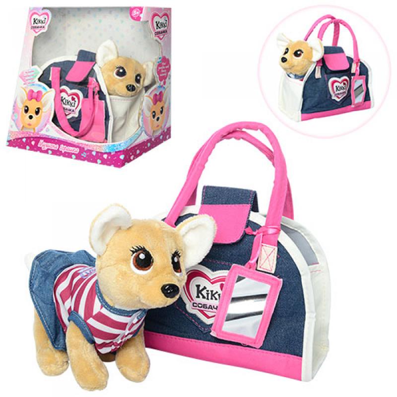 Собачка Кікі така мила, що відразу стане справжнім другом Вашої дівчинки. Вона зроблена з м'якого приємного на дотик плюшу. Вона одягнена в дуже гарний модний костюм. Носити її можна в стильній гламурній сумочці, яка за розміром якраз підійде цій маленькій чихуахуа. Собачка зможе малятко супроводжувати на прогулянки або ходити в гості до своїх подружок, які з великою цікавістю подружяться з таким собачкою. Крім того, собачка обладнана звуковими ефектами, що робить ігри з нею ще веселішими та цікавішими. Інтерактивна іграшка стане справжнім хатнім вихованцем для Вашої доньки, за яким вона з величезним задоволенням буде доглядати, розвиваючи в собі такі потрібні жіночі якості, як материнство. Розвиває фантазію, почуття відповідальності, бажання про когось піклуватися. Розмір собачки: 25 сантиметрів. Кікі та сумка упаковані в красиву подарункову коробочку розміром 29х30х17 сантиметрів.