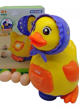 Интересная музыкальная игрушка в виде уточки, которая умеет нести яйца. В комплекте есть 3 яичка, которые нужно положить внутрь игрушки через отверстие на голове птички. Игрушка работает от 3-х батареек ААА, при включении начинает играть веселая песенка и игрушка ездит в произвольных направлениях. Иногда птичка останавливается, чтобы снести яйцо. Размер игрушки: 14х18х12 см. Бренд: KOOME Упаковка: Коробка Цвет: Желтый Тип эл-тов питания: батарейки (ААА) Кол-во эл-тов питания: 3 Эл-ты питания в комплекте: Нет Вес в упаковке: 275 г Габариты в упаковке: 18.5 x 12 x 12 см Габариты без упаковки: 12 x 14 x 18 см Cтрана производитель: Китай Материал: Пластик Комплектация: Птичка, 3 яйца
