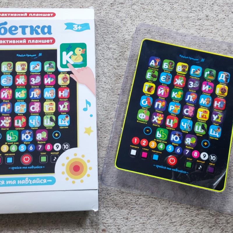 «Вітаю, друже! Ми будемо вивчати українську мову! Ти познайомишся з буквами і звуками українського алфавіту. Почуєш україномовні слова і вивчиш віршики »! 6 режимів навчання в невимушеній атмосфері гри: 1. Перерва: «Перерва! Треба відпочити і побешкетувати, терміново потрібна рухома гра! Давай пограємо в гру «літачок». Рухлива гра для активного відпочинку. 2. Слова: «Вчимо букви і слова. Слухай уважно назви тварин і запам'ятовуй ». Зоо-абетка, цифри, кольори. 3. Навчання: «Кожна буква має свій віршик. Послухай їх ». 43 вірша про буквах і цифрах. 4. Іспит: «А тепер іспит! Давай перевіримо твої знання! Слухай уважно питання і натискай картинки-відповіді ». 85 питань (знайди букву, тварина, кольорову цифру, натисни цифру). 5. Мелодії: «А тепер веселощі! Давай танцювати і співати »! 3 мелодії, 1 весела пісня. 6. Вірші: 2 вірша. Барто в українському перекладі. "Країна іграшок" дарує можливість для навчання в невимушеній атмосфері грі. Весело вчитися, легко і цікаво! Озвучено українською мовою. Працює від 3-х батарейок типу ААА (у комплект не входять).