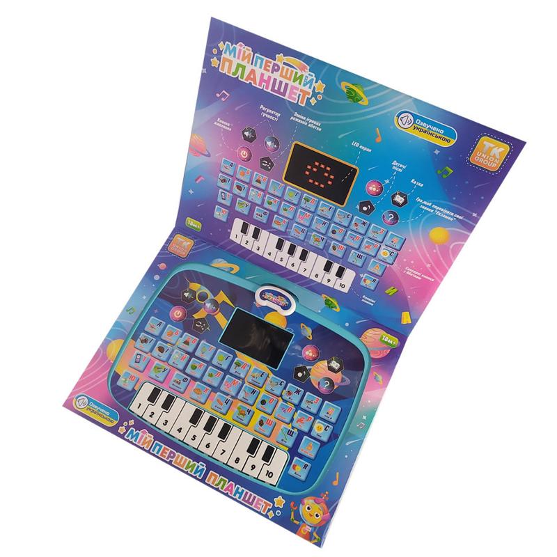 Залучити дитину до навчального процесу простіше простого з новим інтерактивним планшетом від "TK Group". Його ергономічний дизайн, багатий функціонал, зручне сенсорне управління, що "відгукується" на легке натискання пальчиком та безліч цікавих ігор стануть справжньою знахідкою для допитливого малюка. Особливості: - іграшка має компактні розміри, щоб зручно розташуватися в маленьких дитячих ручках; - яскравий дизайн із кольоровими зображеннями; - планшет обладнаний LED екраном, на якому відображаються літери українського алфавіту та позначки; - сенсорні кнопки; - у нижній частині планшета знаходяться 10 клавіш піаніно; - ліворуч і праворуч від екрана розташовані 8 кнопок: 1 - увімкнення; 2,3 - регулювання гучності; 4 - зміна ігрових режимів; 5 - дитячі пісні українською мовою; 6 - розповідь казок; 7 - потішні мелодії; 8 - гра для перевірки знань "Іспит". Іграшка працює в 3-х режимах: 1 - вивчення українського алфавіту; 2 - вивчення слів; 3 - прослуховування віршиків на кожну з букв алфавіту. Тип живлення - 3 батарейки "АА" (не входять до комплекту). * Характеристики та комплектація товару можуть змінюватися виробником без повідомлення