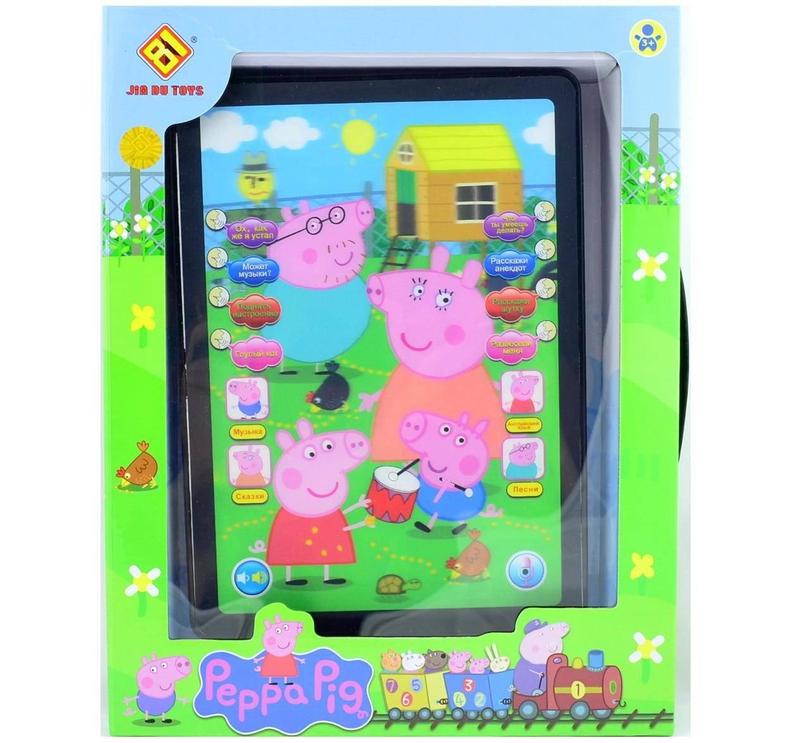 Дитячий іграшковий планшет -- це чудова альтернатива для тих батьків, які не хоча б, щоб дитина весь день сиділа в ґаджетах, але мав свій, який у будь- якому разі зробить малюка щасливим, тому що планшет , як точна сьогодення. На телефоні заставка з улюбленого мультика Свинки Пеппи. Планшет інтерактивний - навчальний музичний планшет співає Вашій дитині пісні, розповість казки, відтворить слова англійською мовою та переведе їх російською мовою. Має функцію "Півторюшка". Під час натискання на кнопку Вмик/ВИМИК телефон почне відтворення інших аудіофайлів. У іграшкового смартфона є безліч функцій: -Вибірне або безперервне відтворення казки музика Англійська мова пісні гучність (є кнопка регулювання). мікрофон незвичайний підбивач