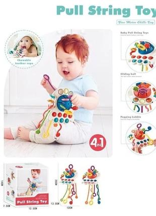 Розмір упаковки:12 см × 7 см × 14 см Паковання:Коробка Вік:від 1 років “Pull String Toy” - розвивальна іграшка у новому, неймовірно цікавому форматі. Вона поєднує в собі популярний поп-іт, кульку, що ковзає, тягнучку та міні-пальчикову гру. Особливості: - на пластиковій платформі розмішені 4 гри; - кольорові мотузочки для перетягування виготовлені з еластичної гуми та мають різну текстуру і форму; - у нижній частині ігрової платформи розміщені 2 ряди поп-іт синього та рожевого кольорів; - гра з ковзкою кулькою полягає у пересуванні її зі сторони в сторону по трьох комірках; - всередині великої центральної кульки знаходиться елемент, що брязкає; - на одному з боків дитина знайде міні-пальчикову гру. Іграшка спрямована на розвиток дрібної моторики, координації рухів, логічного мислення, сприйняття кольорів та форм.