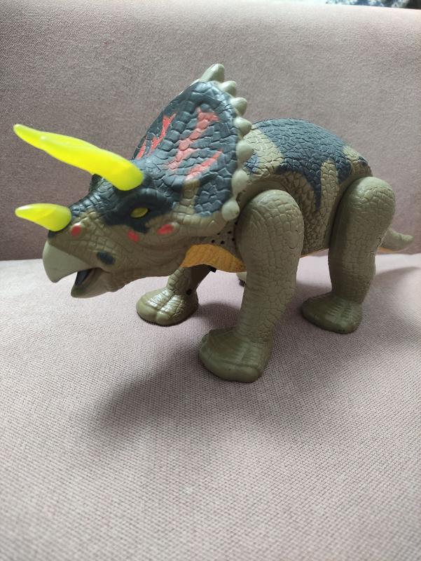 Динозавр, світові ті звукові ефекти. Динозавр при ходьбе двигает головой и хвостом, издает реалистичные звуки в виде рычания, а также у него светятся глаза и рога на голове.