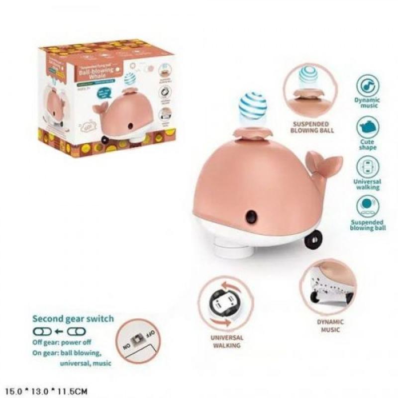 Оригінальна музична іграшка у формі кита, який може балансувати кульками в повітрі. Під час увімкнення кит починає випускати потік повітря з отвору на голові, завдяки чому створюється ілюзія того, що кулька "лівітує". Іграшка також обладнана звуковими ефектами (відтворює мелодії) і їздить у довільних напрямках. Працює від 3 батарейок АА. Різні кольори в асортименті.