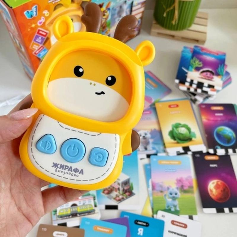 Інтерактивний планшет - кардридер Жирафа-всезнайко озвучений українською мовою. Містить 122 двосторонніх картки (244 зображення). Варто лише вставити одну з карток у віконечко планшета, як малюк почує назву картинки українською мовою. Загалом на картках зібрано 18 тем для навчання, а також казки, вірші та пісні. Опис карток: 18 тем, казки, пісні, віршики. 1-10 екзотичні тварини; 11-20 фрукти; 21-30 музичні інструменти; 31-40 свійські тварини; 41-60 міське середовище; 61-70 гардероб; 71-80 овочі; 81-90 кольори; 91-100 геометричні фігури; 101-110 цифри; 111-120 транспорт; 121-130 космос (планети); 131-160 морські жителі; 161-175 побутові прилади; 176 = 5 дитячих пісень; 177-186 членистоногі; 187-196 птахи; 197-210 професії; 211-243 абетка; +5 казок. Планшет працює від акумулятора, зарядний пристрій до якого входить в комплект. Іграшка рекомендована дітям від 3-х років, але під наглядом дорослого її можна використовувати уже з однорічного віку. Розмір 13*9см