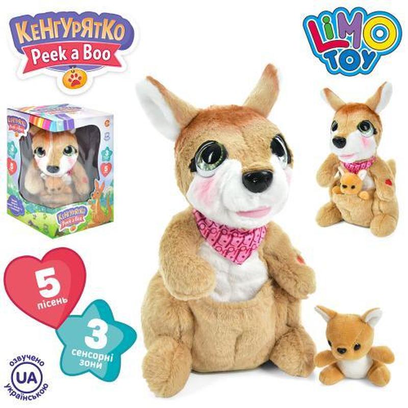 Інтерактивна іграшка "Кенгулятко", 26 см. Озвучення українською мовою. 3 сенсорні зони, маленька тваринка 7 см в наборі. Звукові ефекти та музика. В пам'яті пісні та лічилочка. Живлення - батарейки. Упаковка - коробка. Розмір - 19х19х28 см.