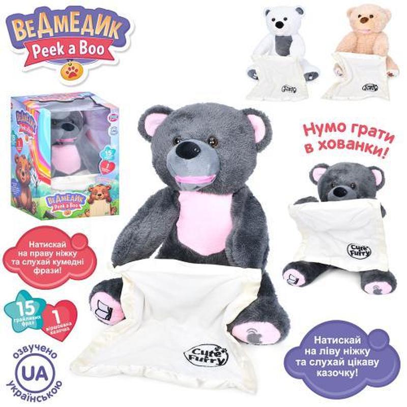 Інтерактивна іграшка "Ведмедик", 25 см, 3 види. Озвучення українською мовою. Рухається, грається в хованки. Звукові ефекти та музика. В пам'яті казочка та цікаві фрази. Живлення - батарейки. Паковання — коробка. Розмір - 19х19х27,5 см.