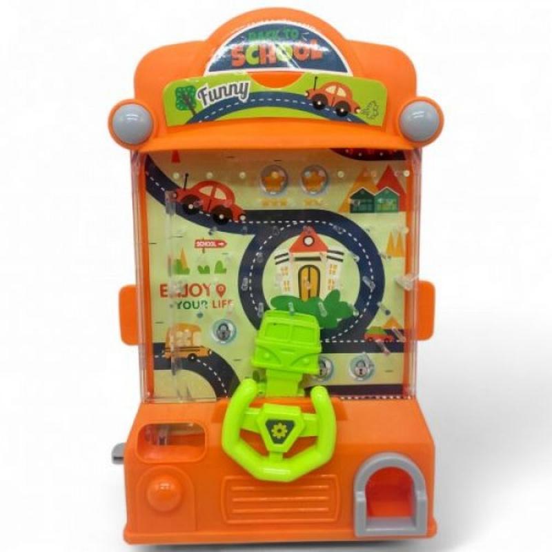 Игрушка "Игровой автомат: Back to School". Сверху игрушки есть отверстие, в которое нужно закинуть шарики. После этого они начнут спускаться вниз. Палочки-помехи будут менять направление шариков, а ребенку, управляя корзиной, нужно их ловить. Работает без батареек.