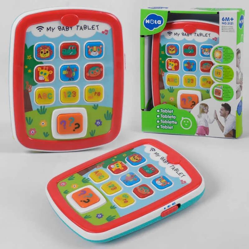 Дитячий розвиваючий планшет виконаний у сучасному дизайні та оснащений активними кнопками зі звуковими та світловими ефектами. Мова озвучення англійська. Розвиваючий матеріал: - різні кольори: синій, жовтий та червоний; - Розкаже про тварин; - озвучить літери ABC; - озвучить цифри 1,2,3; - відтворено тони: до, ре, ми активує мелодію. Кнопка зі знаком питання ставить запитання на тему: - кольору; - Тварини; - Цифри, літери, ноти. Перемикач вмикає та вимикає планшет, а також налаштовує гучність – тихо/голосно. Працює від 3 батарейок типу «ААА» - не входять в комплект. * Характеристики та комплектація товару можуть змінюватися виробником без попередження (3121)