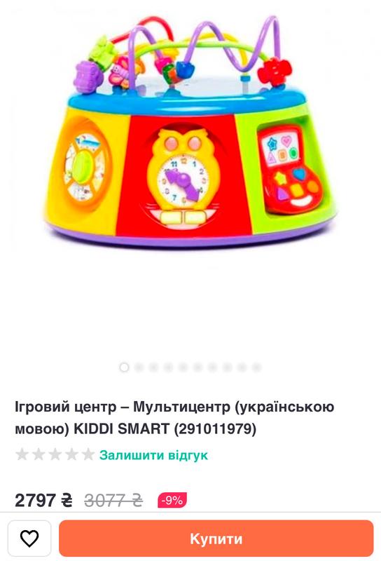 Ігровий набір Мультицентр, озвучений українською мовою, - оригінальна музична та розвиваюча іграшка, справжній багатофункціональний ігровий центр. Особливості Мультицентра: На одній зі сторін іграшки розташовані клавіші піаніно та інші музичні інструменти з реалістичними звуками. На іншій - звучать три дитячі народні пісеньки в супроводі світлових ефектів: «Ой, є в лісі калина», «Вийди, вийди, сонечко», «Як діждемо літа». Яскраві зображення та пізнавальні віршики познайомлять малюка з порами року. Годинник у формі сови допоможе ознайомитися з розпорядком дня. Справжній сюрприз - комп'ютер з 2 пісеньками про форми, завдяки яким малюк дізнається, як виглядають фігури та як їх малювати. На верхній частині розташовано лабіринт з яскравими намистинами, для розвитку дрібної моторики. Рекомендовано професійним психологом, педагогом дошкільної освіти: 1. Мультицентр є чудовим інструментом для розвитку музичного слуху. Мелодійні українські пісні підібрані спеціально до віку дітей – мають простий сюжет і спонукають малечу до повторювання та підспівування. 2. Опція «Телефон» знайомить дітей з першими важливими фразами у спілкуванні людей, а саме: «Добрий день!», «Добрий вечір!» «До зустрічі» Це формує перші навички спілкування та соціальну компетентність дитини. 3. Знання геометричних фігур, які представлені у «мультицентрі» є чудовим підґрунтям для формування просторового мислення, як основи – математичного. Озвучка назв геометричних фігур спонукає дітей до повторення. Таким чином, відбувається процес навчання. 4. Годинник, який дитина вивчатиме разом з «Мультицентром» забезпечує усвідомлення таких понять, як: «ранок», «день», «вечір», «ніч». Що є базою для формування часових і просторових понять. Стрілка – рухома, це забезпечує дитині раннього віку формування вказівного жесту – важливого етапу в розвитку соціально-комунікативних навичок. Годинник у «Мультицентрі» формує візуальне сприйняття дитиною цифр і сприяє запам’ятовуванню. Ігровий набір Мультицентр Kiddi Smart допоможе малюкові розвинути такі навички: дрібна моторика; сенсорика; мовлення; пам'ять; логіка; cвітогляд; музичний слух; емоційне сприйняття. ❗️❗️❗️Повернення нема. Відправка після оплати на картку будь якою поштою. Якщо хочете оглянути - оформлюйте безпечною оплатою з Новою поштою чи Meest express