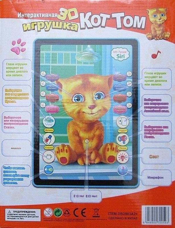 Детский планшет говорящий 3D Кот Рыжик Интерактивная говорящая игрушка Кот Рыжик DB 6883 H 2 – веселый собеседник для Вашего ребенка, он обладает хорошим чувством юмора, четкой речью и хорошей звуковой подачей, что хорошо влияет на развитие у ребенка правильного произношения звуков и улучшает способности общения с окружающим миром. Реагирует не только на голос, но и на звуки (хлопки, щелчки). Юморной кот повторит все слова сказанные Вами смешной интонацией. Выполнен он по подобию персонажа из игр для iPhone и Android. Популярные песни шутки, история входят в содержания маленького затейника. Характеристики: Красивая картинка высококачественная с эффектом 3 D. Чистый звук – цифровая обработка сигналов Crista Voice. Распознает звуки в пределах 8-10 метров. Используется система LED – для мерцания глаз ( во время диалога или записи ). Сенсорное управление – легкое нажатие кончиками пальцев приводит в действию кнопок, а также прикасаясь к частям тела кота он издает звуки. Чип нового поколения, который и отвечает за быстроту обработки информации. Материал, из которого исполнена игрушка, совершенно безопасен и обладает хорошей прочностью. Воспринимает 8 фраз и у него есть на них около 39 оригинальных и веселых, остроумных ответов. Лапки, щечки, глазки, животик, хвостик, лобик – реагируют на прикосновение звуковым или световым эффектом. Для детей старше 3-х лет. Размер коробки: 245мм*315мм*50мм Размер: 25см*18см*3см Питание: 3шт х АА (в комплектацию не входят) Цвет: розовый, черный, синий, белый Комплектация: - Планшет - Ножка-подставка - Инструкция - Коробка картонная с ручкой