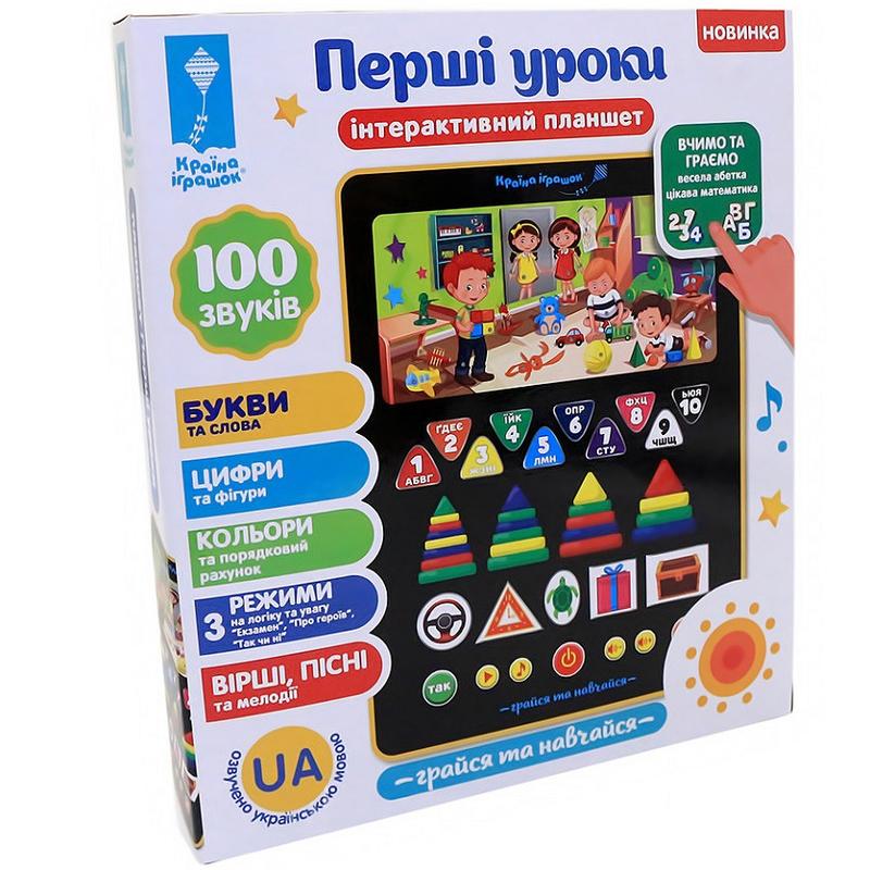 Дитячий планшет надає можливість для навчання в невимушеній атмосфері гри. Планшет має безліч функцій: вивчення букв, слів, квітів, фігур і цифр. А також 3 режиму на логіку і увагу, вірші, мелодії і пісеньки, 100 звуків. "Перерва" - весела рухлива гра, що дозволяє дитині відпочити від навчання. "Іспит" - перевіримо знання. Уважно слухайте запитання і натисніть правильні відповіді. Планшет озвучений українською мовою. Працює від 3 батарейок типу ААА (у комплект не входять). Розмір планшета 19 * 1 * 24 див. Розмір коробки 26 * 3 * 30 див.