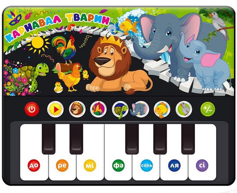 Планшет включает в себя: 6 страниц весёлых историй, 3 игры, мелодии и песни, звуки настоящего фортепиано, ноты и подсказки, 100 звуков на украинском языке. В верхней части планшета находится небольшая книжечка с интересными историями о животных. Планшет работает в нескольких режимах: режим веселые истории, режим игра на пианино, режим угадай мелодию, режим хоровод нот, режим найди ноту, режим мелодии. Озвучен на украинском языке. Работает планшет от 3 батареек типа ААА (в комплект не входят). Размер планшета 21 * 2 * 18 см. Размер коробки 26 * 3 * 30 см.