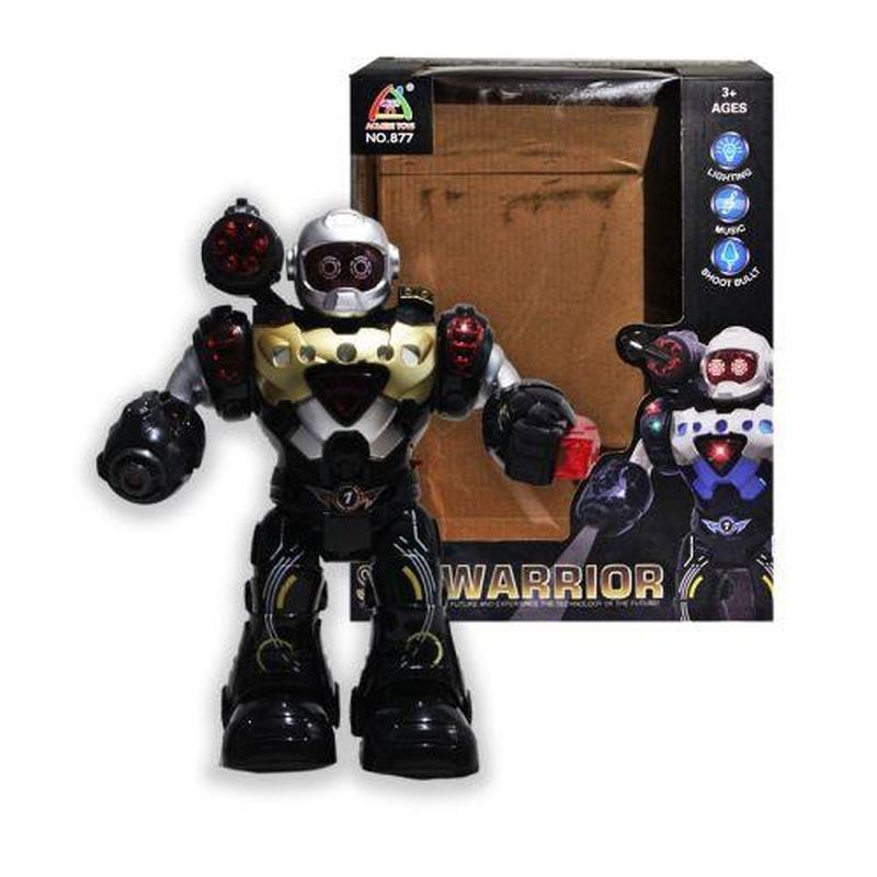 Уцінка. (Відламана рука) Робот "Star Warrior" зі світловими та звуковими ефектами. Миттєво рухається в різних напрямках, рухає руками, світиться і видає звуки стрільби під час ходьби. Має функцію проєкції: проєктує кругле зображення на підлогу або стіну. Стріляє снарядами, які є в комплекті (щоб робот стріляй, потрібно натиснути на кнопку на гарматі). Розмір робота: 20х24х10 см. Паковання: Коробка Колір: жовтий Тип ел-тів живлення: Батарейки (АА) Кількість ел-тів живлення: 3 Ел-ти живлення в комплекті: Немає Вага в упаковці: 480 г Габарити в упаковці: 12 x 21.5 x 28 см Габарити без паковання: 10 x 20 x 24 см Страна виробник: Китай Матеріал: Пластик Комплектація: Робот, 3 снаряди
