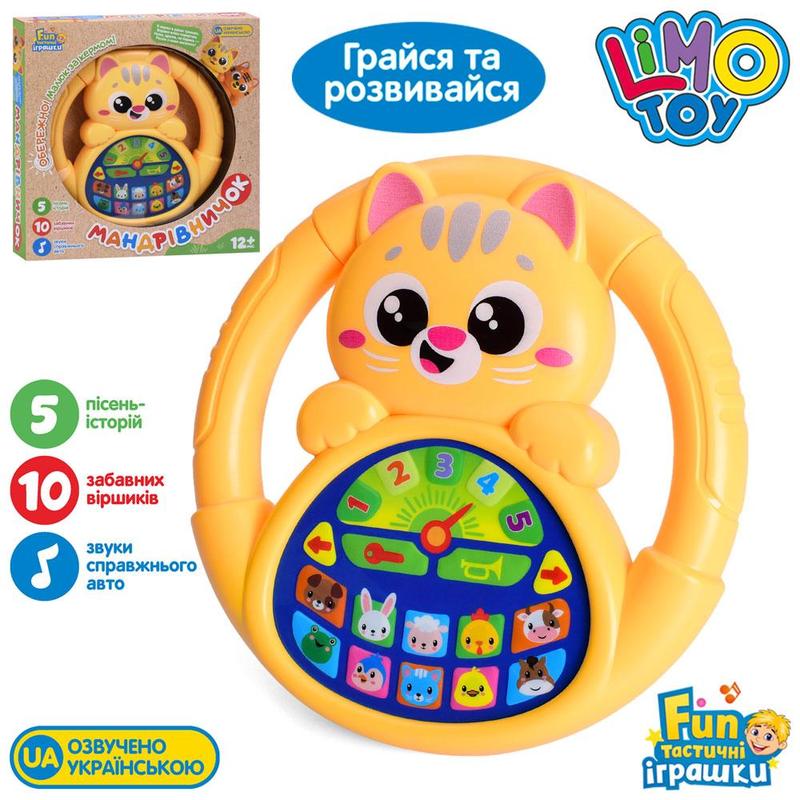 Інтерактивне кермо «Мандрівничок» Limo Toy — музична розвивальна іграшка для малюків від 12 місяців. Іграшка виконана у формі яскравого котика та оснащена кнопками з цифрами й тваринками. Дитина може слухати 5 пісень-історій, 10 веселих віршиків і звуки справжнього автомобіля. Кермо сприяє розвитку слухового сприйняття, пам’яті, уваги, дрібної моторики та координації рухів. Озвучено українською мовою. Чудовий варіант для гри та навчання водночас. Матеріал : Пластик Виробник : Limo toy