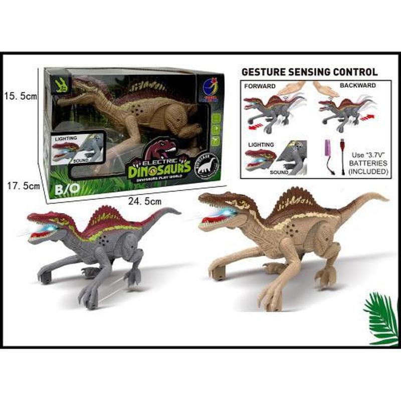 Інтерактивна іграшка "Динозавр", 23 см, 2 кольори. Реагує на руку, є звукові та світлові ефекти. Живлення - акумулятор (USB шнур в комплекті). Матеріал - комбінований. Упаковка - коробка. Розмір - 24,5х17,5х15,5 см.