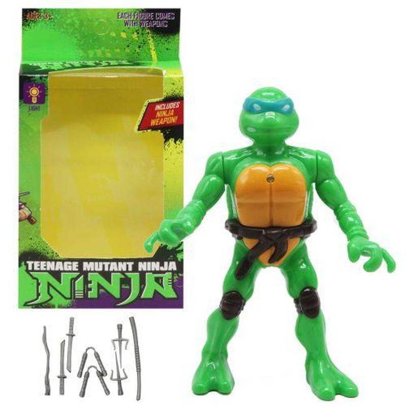 Пластиковая фигурка в виде персонажа легендарного мультфильма "Черепашки ниндзя". Детализированная, похожа на своего мультяшного прототипа. У героя подвижные руки. На спине кнопка, которая включает лампочку на груди. Размер фигурки - 12,5 х 8,5 см. В наборе комплект оружия всех 4-х черепашек. _