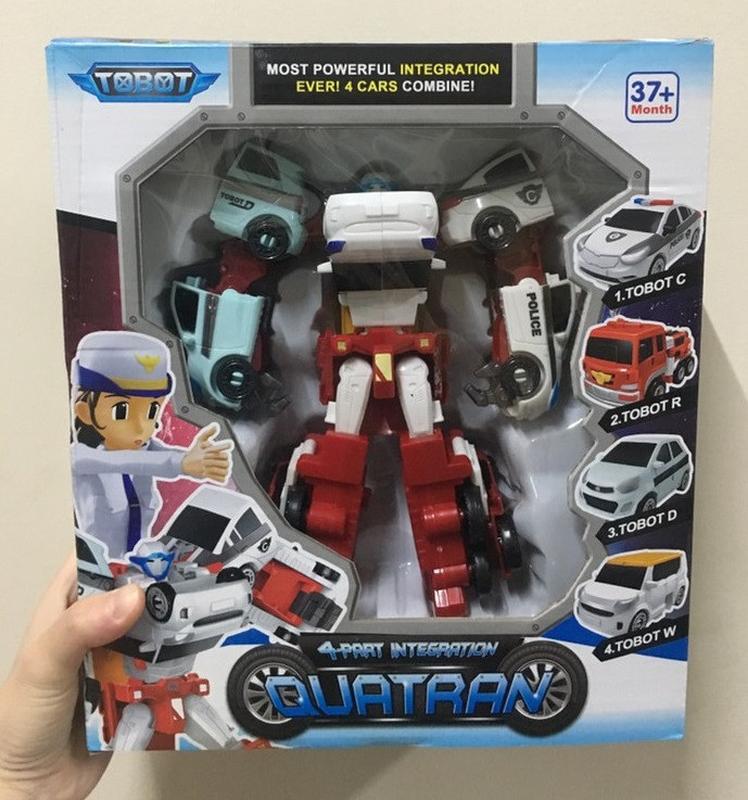 Один из самых интересных тоботов - Кватран. Его уникальная особенность в том, что он собирается из четырех тоботов -- машинок. Полицейский тобот С, пожарный R, тоботы D и W интегрируются в огромного робота. Игрушка сделана в полном функциональном и внешнем сходстве с мульт героем. Трансформация Кватрана в четыре машинки и обратно происходит легко и доступно для ребенка. В собранном виде Квадран имеет подвижные конечности. Высота робота 20 см. Размер коробки 24 * 9 * 28 см.