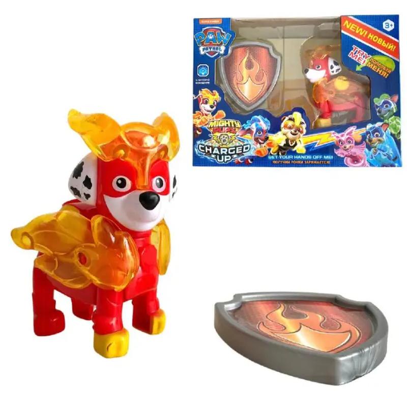 Ігрова фігурка Paw Patrol Щенячий патруль Маршал Яскрава фігурка собачки, персонажа мультфільму "Щінячий патруль. Mighty Pups Charged Up". Оснащена яскравим різнобарвним підсвічуванням, яке активується після натискання кнопки на рюкзачці. У цуценя рухливі передні лапки та голова. Також у наборі є значок, який можна чіпляти на одяг. Виготовлена з якісних та безпечних матеріалів. Висота фігурки: 7 см