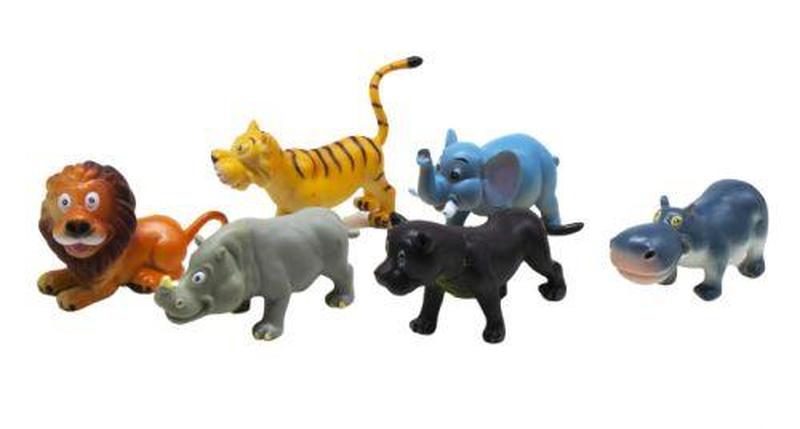 Набір "Дикі тварини". У наборі 6 іграшок: слон, лев, пантера, носоріг, тигр, бегемот. Розмір фігурки — 11 х 5,5 см.