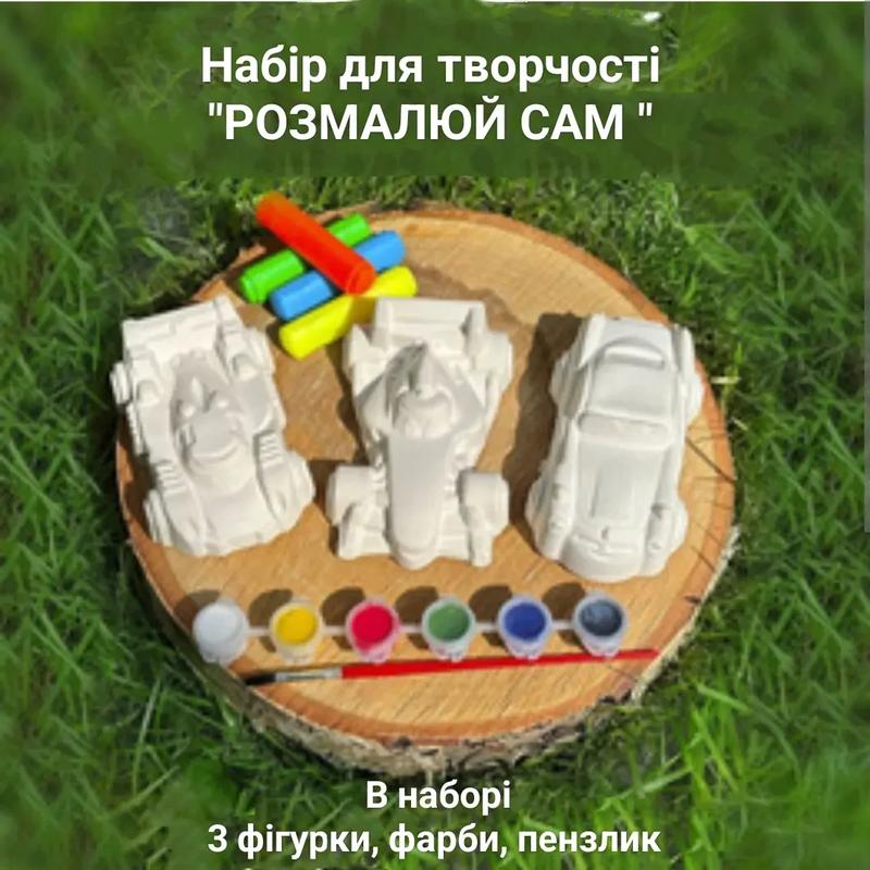 Гіпсові фігурки размальовки машинки Гонки. Набір складається з 3 різних видів машинок розміром 12 см , які ваша дитина з задоволенням розмалює та буде гратися з друзями, фарби та пензлик.