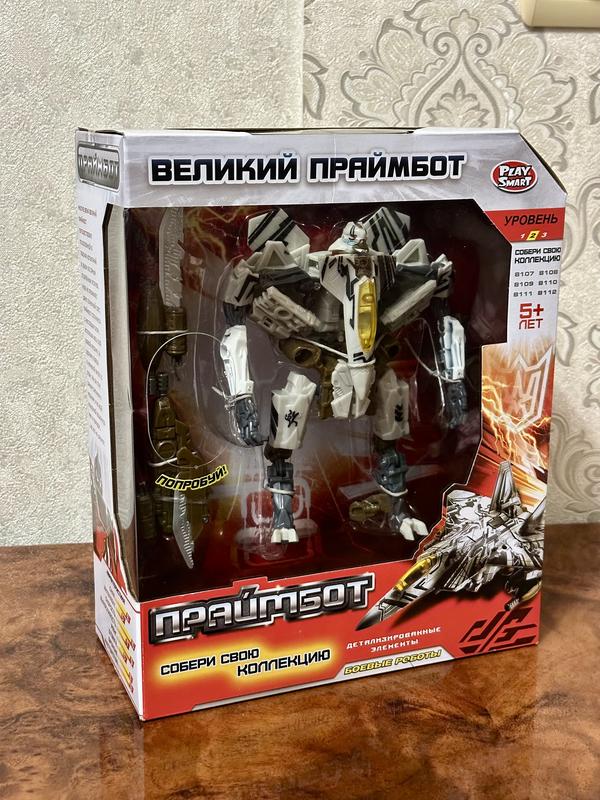 Трансформер Великий Праймбот Робот літак винищувач. Техніка та транспорт дуже популярні як іграшки для хлопчиків, а якщо вони ще й можуть перевтілюватися в щось інше, то це цікавіше подвійно. Завдяки своїй задуманій конструкції, трансформери здатні захопити дитину не на одну годину, крім того, вони позитивно впливають на розвиток дрібної моторики, координації рухів, уяви, дають десятки ідей для сюжетних ігор.Робот-трансформер з відомого кінофільму. Завдяки нехитрим рухам робот перетворюється на літак винищувач. Розмір упаковки 27-22-9,5 см